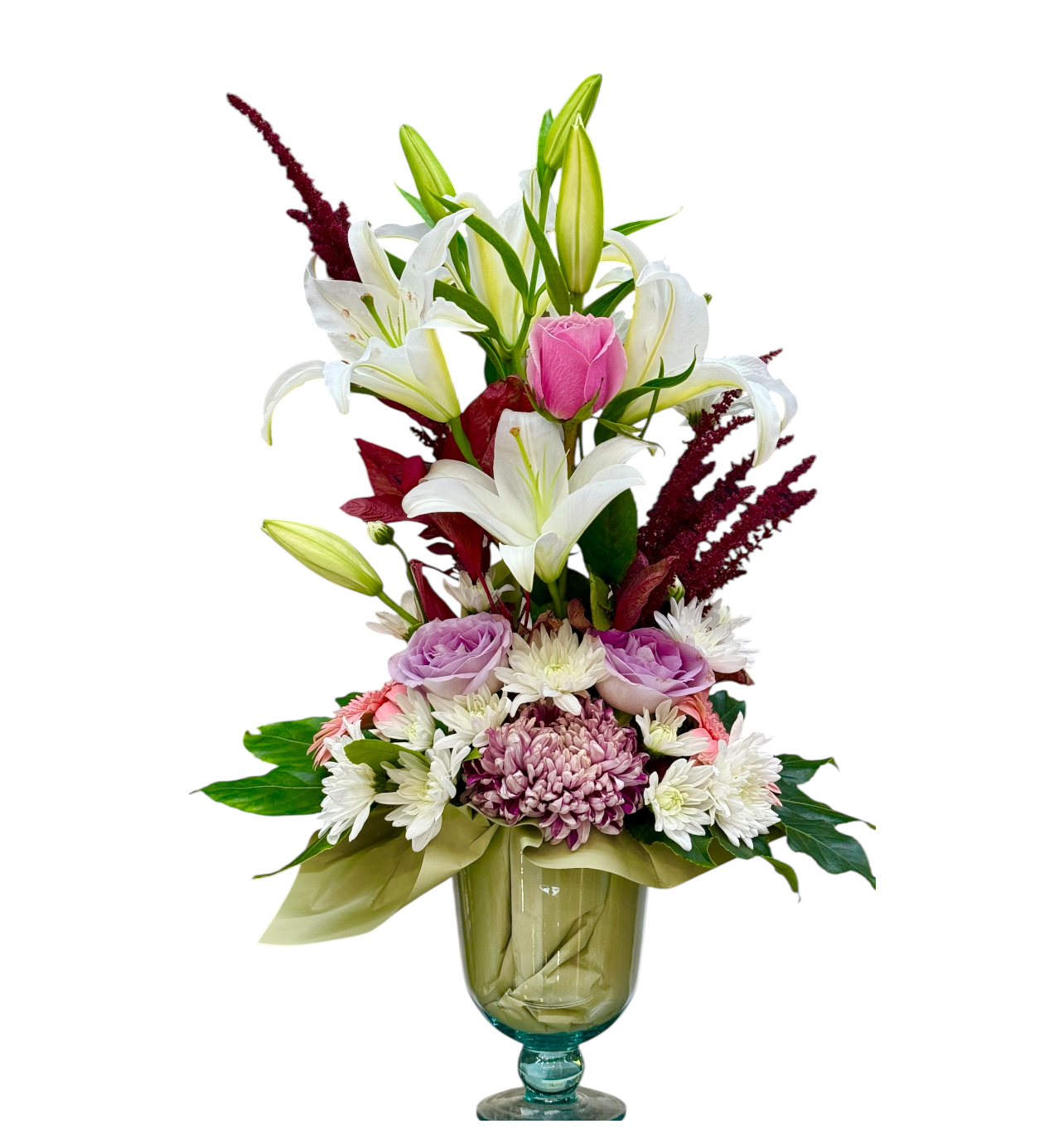 Cam vazo içerisinde beyaz lilyum, pembe anastasia, mor lisiantus, beyaz papatya ve dekoratif yeşilliklerle hazırlanmış zarif bir masa aranjmanıdır. Modern cam vazosu çiçeklerin doğal güzelliğini ön plana çıkarır.