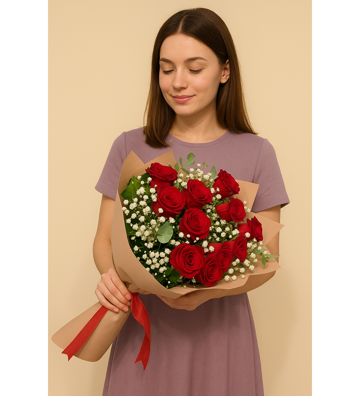 Zarafeti ve aşkı temsil eden 10 adet canlı kırmızı gül beyaz cipso çiçekleriyle ve yeşil dekoratif yapraklarla tamamlanarak hazırlanmıştır Kraft kâğıt ambalaj içerisinde sunulan bu şık buket kırmızı saten kurdeleyle bağlanmıştır Yaklaşık 55 60 cm boyundadır Romantik duruşu ile sevgiliye eşe doğum günü ya da özür dileme gibi özel anlarda duygularınızı en içten haliyle iletir