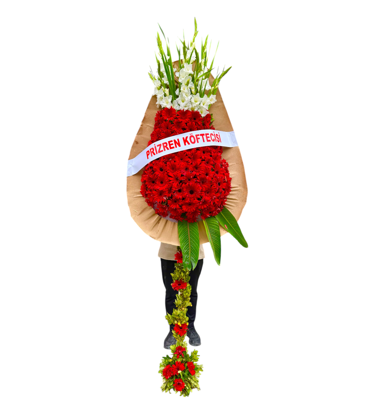 Yaklaşık 2 Metre Boyundaki Bu Gösterişli Açılış Çelengi Kırmızı Gerberalar Ve Beyaz Glayöt Çiçekleriyle Hazırlanmıştır Üst Kısmında Zarif Beyaz Glayötler Yer Alırken Alt Kısmı Tamamen Kırmızı Gerberalardan Oluşur Orta Kısmında İsteğe Göre Firma Veya Kişi Adı Yazılabilir Alt Bölümde Sarkıt Olarak Devam Eden Kırmızı Gerbera Ve Yeşil Yapraklar Çelengin Bütünlüğünü Tamamlar