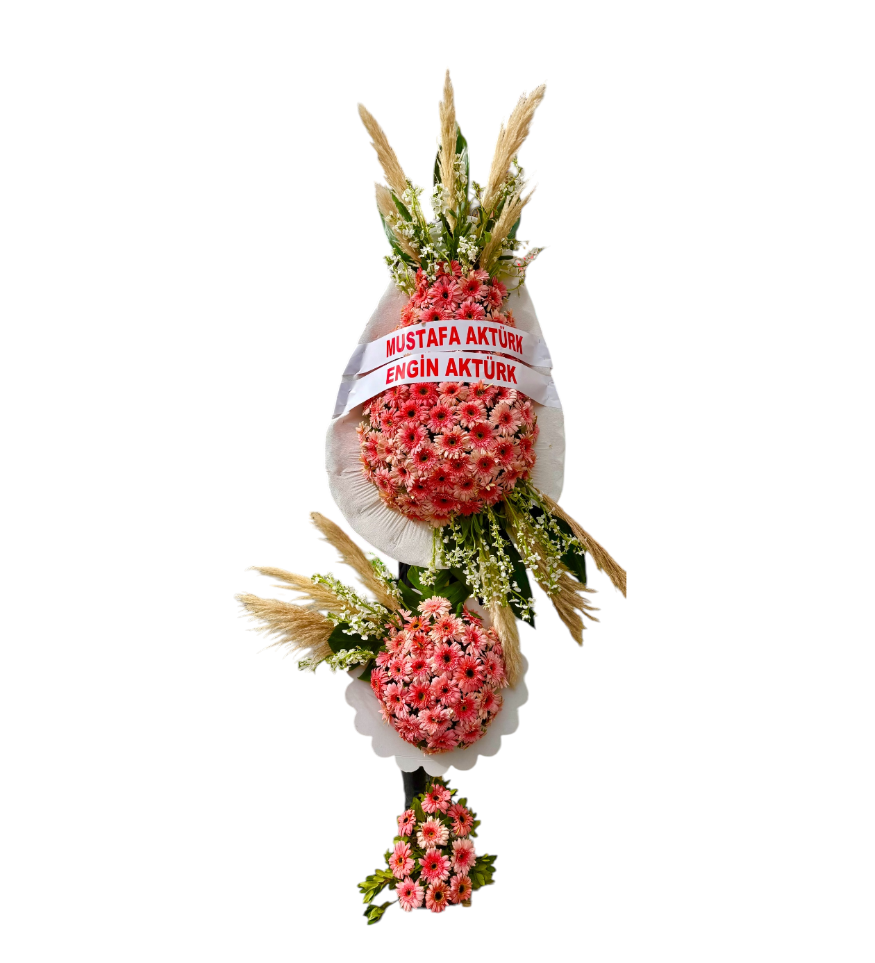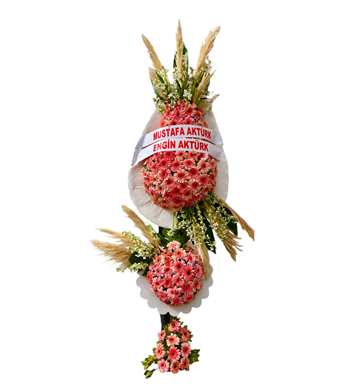 Çiçekçi Benim tarafından özenle hazırlanan bu çift katlı premium çelenk, zarif pembe gerbera çiçekleri ile göz alıcı bir tasarıma sahiptir. Üst ve alt bölümde yoğun çiçek kullanımı ile dolgun ve ihtişamlı bir görünüm sunar. Doğal yeşillikler ve dekoratif kuru başak detayları ile modern ve şık bir stil oluşturulmuştur.