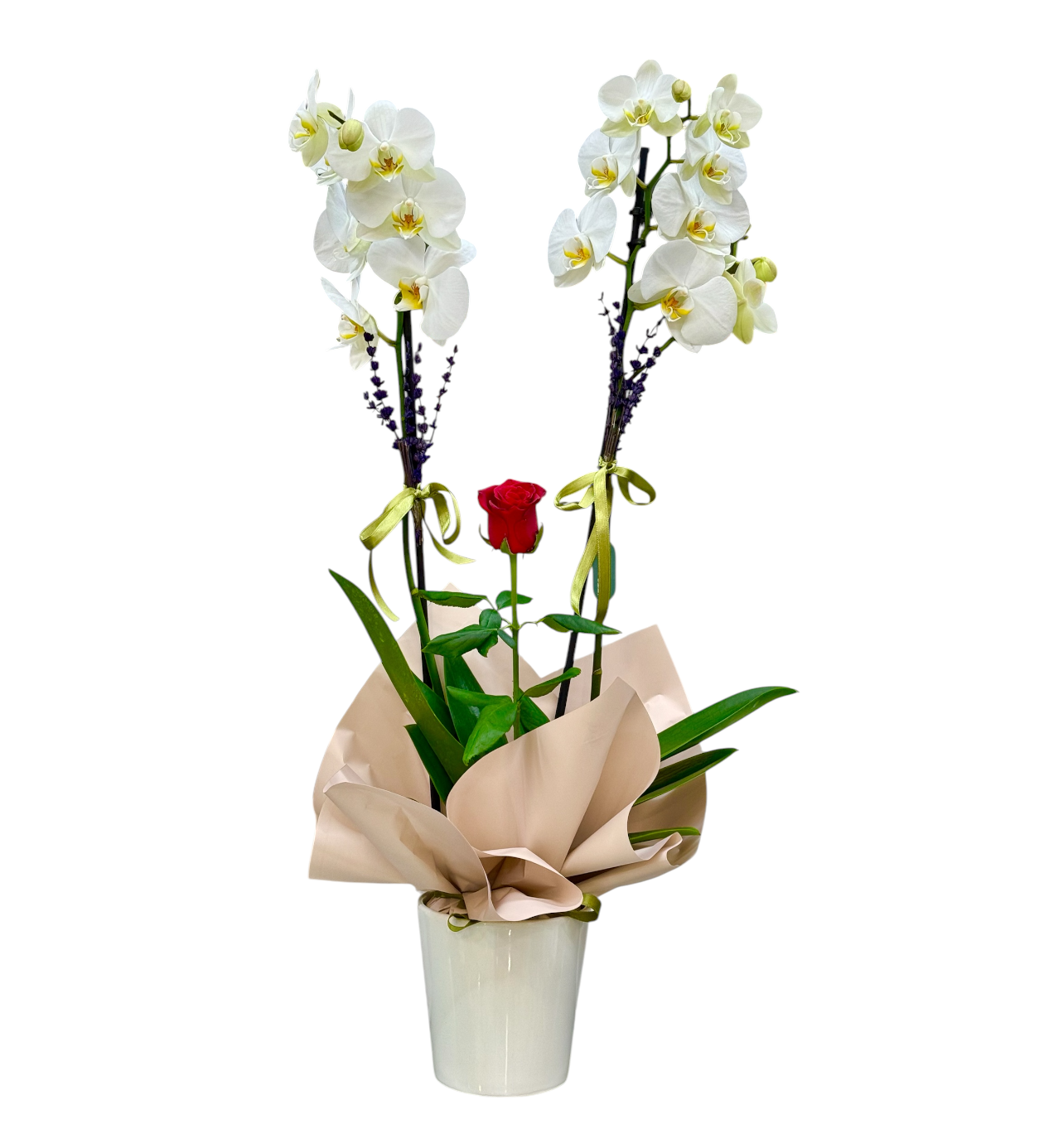 Şık seramik saksı içerisinde çift dal beyaz orkide ve ortasında yer alan tek kırmızı gül ile hazırlanmış özel bir tasarımdır. Beyaz orkideler saf sevginin, kırmızı gül ise tutkunun simgesidir. Zarafet ve romantizmi bir araya getiren bu aranjman, özel günlerin en anlamlı hediyesidir.