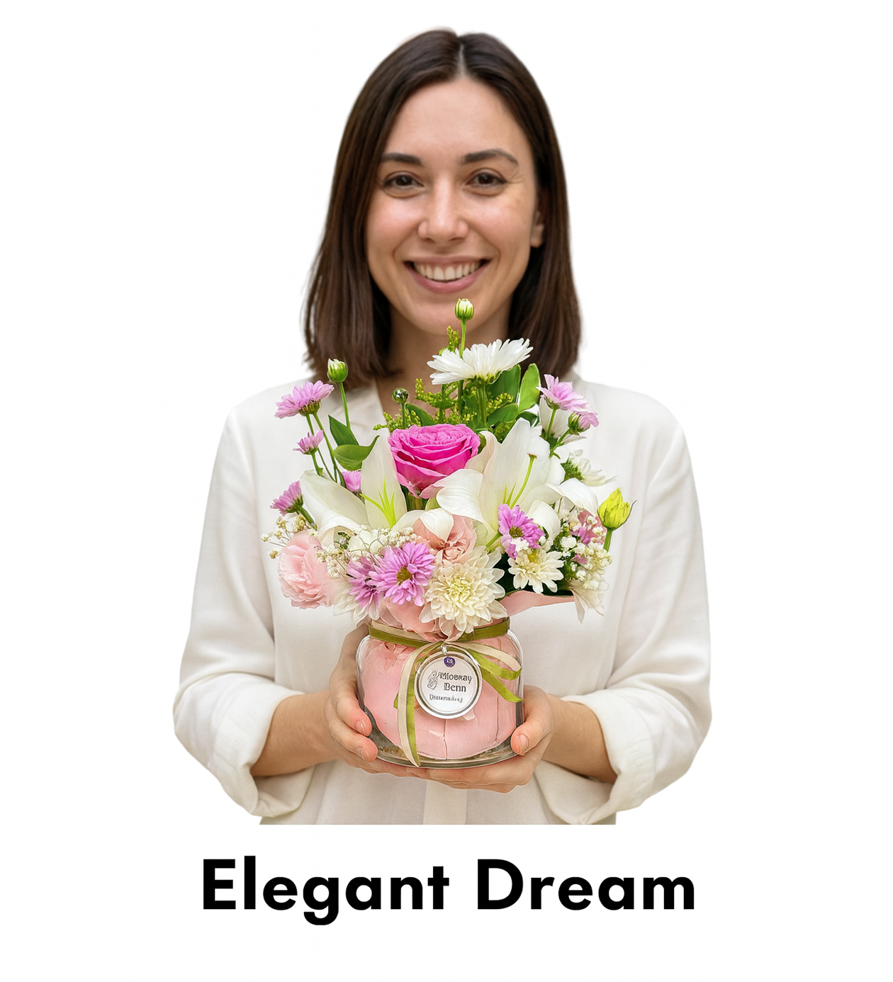 Yaklaşık 35–40 cm boyunda cam vazo içerisinde hazırlanmış zarif bir aranjmandır Pembe gül beyaz lilyum beyaz ve lila krizantemlerle tamamlanan bu tasarım zarafet ve huzurun birleşimidir Yumuşak tonların oluşturduğu uyum pastel romantizmini yansıtır Sevgiyi neşeyi ve inceliği simgeler