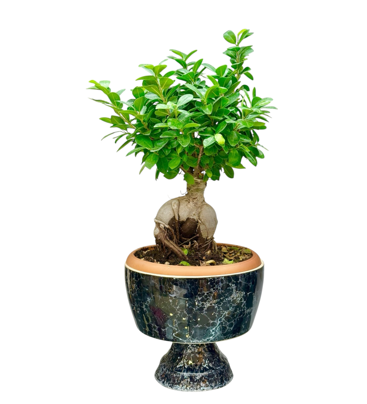 Doğanın minyatür hali olarak bilinen bonsai ağacı 25x30 cm boyutlarında özel seramik saksıda köklü formuyla estetik bir duruş sergiler Ev veya ofis dekorasyonuna doğal bir zarafet katar Gövde yapısı ve sık yeşil yaprakları ile dayanıklı bir bitkidir Az bakım gerektirir ve uzun yıllar canlılığını korur