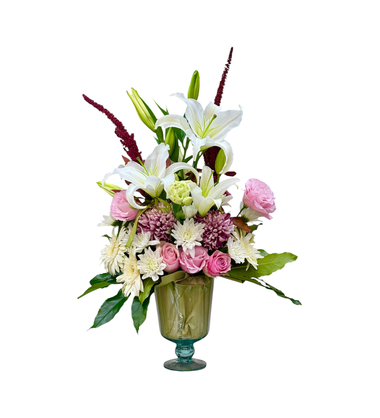 Cam Ayaklı Vazo Beyaz Lilyum Pembe Gül Lisyantus Kasımpatı Şebboy Ve Doğal Yeşillikler Kullanılmıştır