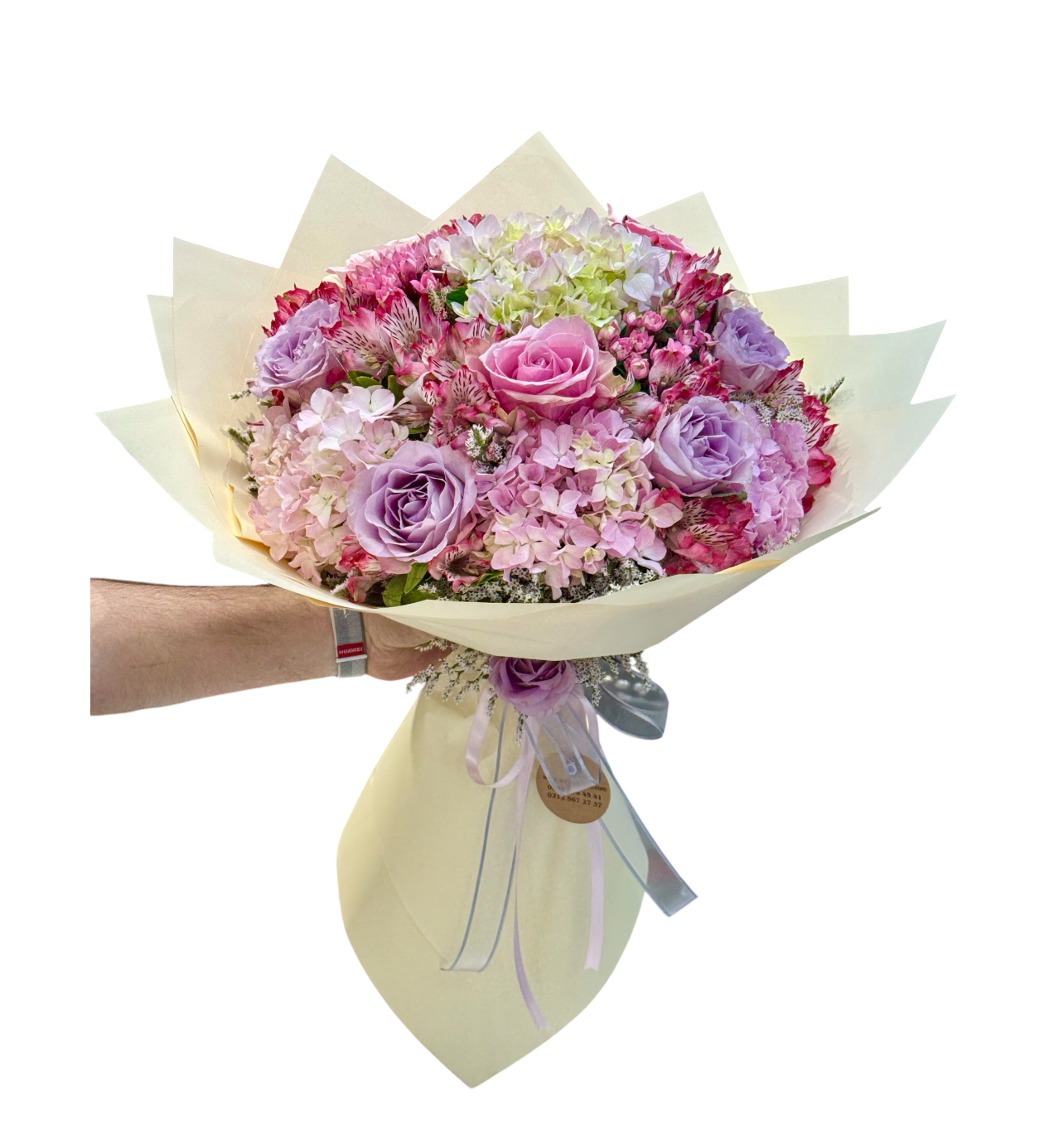 Pastel tonların zarif uyumuyla hazırlanmış bu özel buket, lila güller, pembe ortancalar, alstromeryalar ve yumuşak tonlu mevsim çiçekleriyle oluşturulmuştur. Krem rengi zarif ambalajı ve uçuşan kurdele detaylarıyla romantik bir şıklık sunar.
