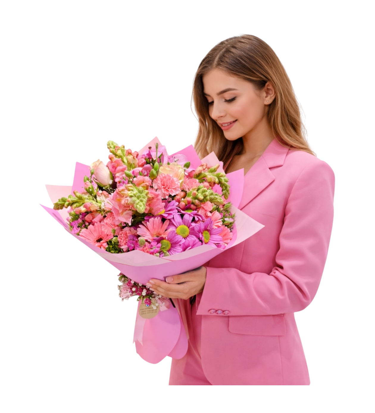 Pembe tonların canlılığı ve farklı çiçeklerin uyumu ile hazırlanan bu buket pozitif ve enerjik bir etki yaratır