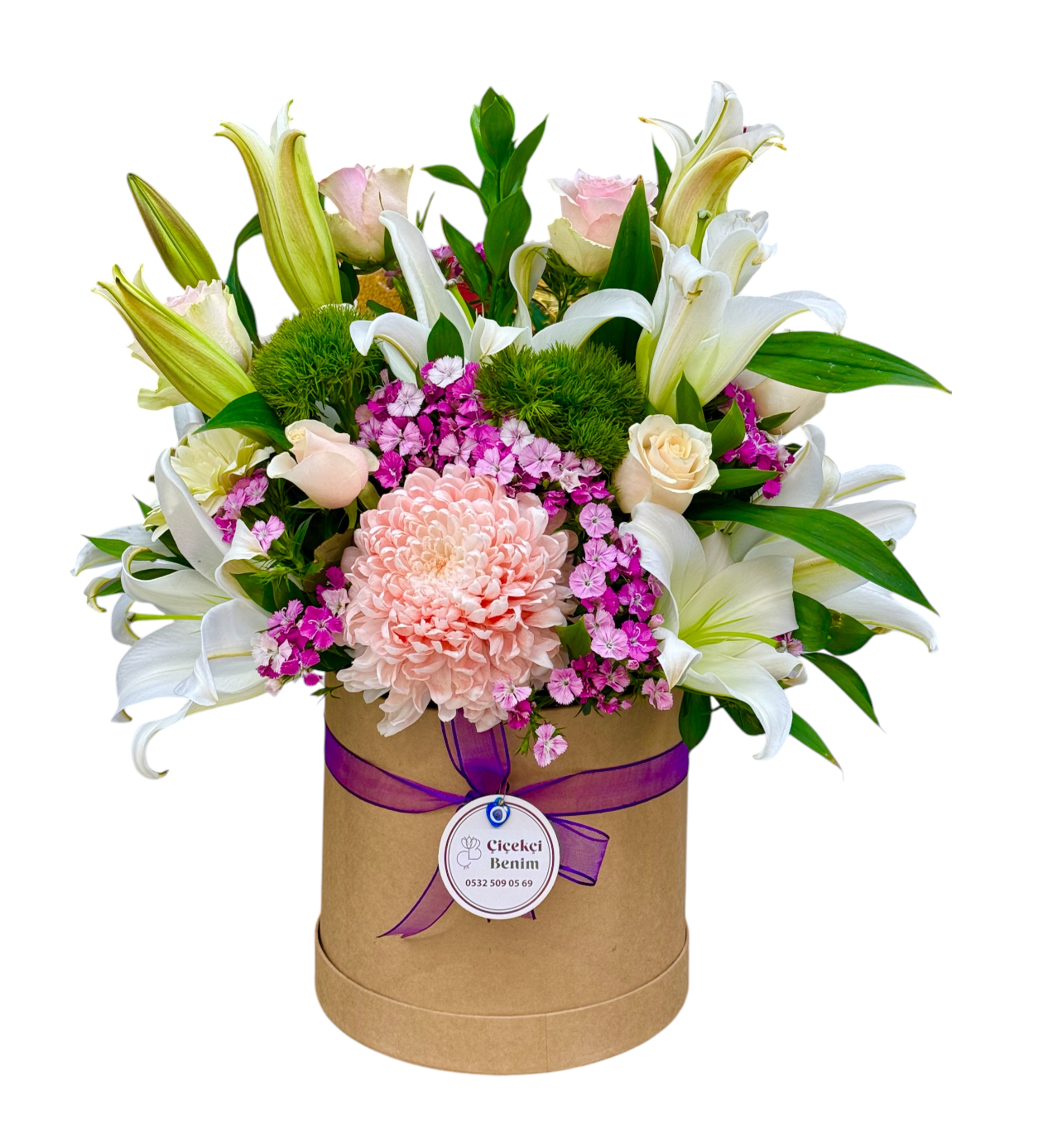 Silindir Kutu Beyaz Lilyum Pembe Gül Şebboy Kasımpatı Mor Çiçek Ve Doğal Yeşillikler Kullanılmıştır