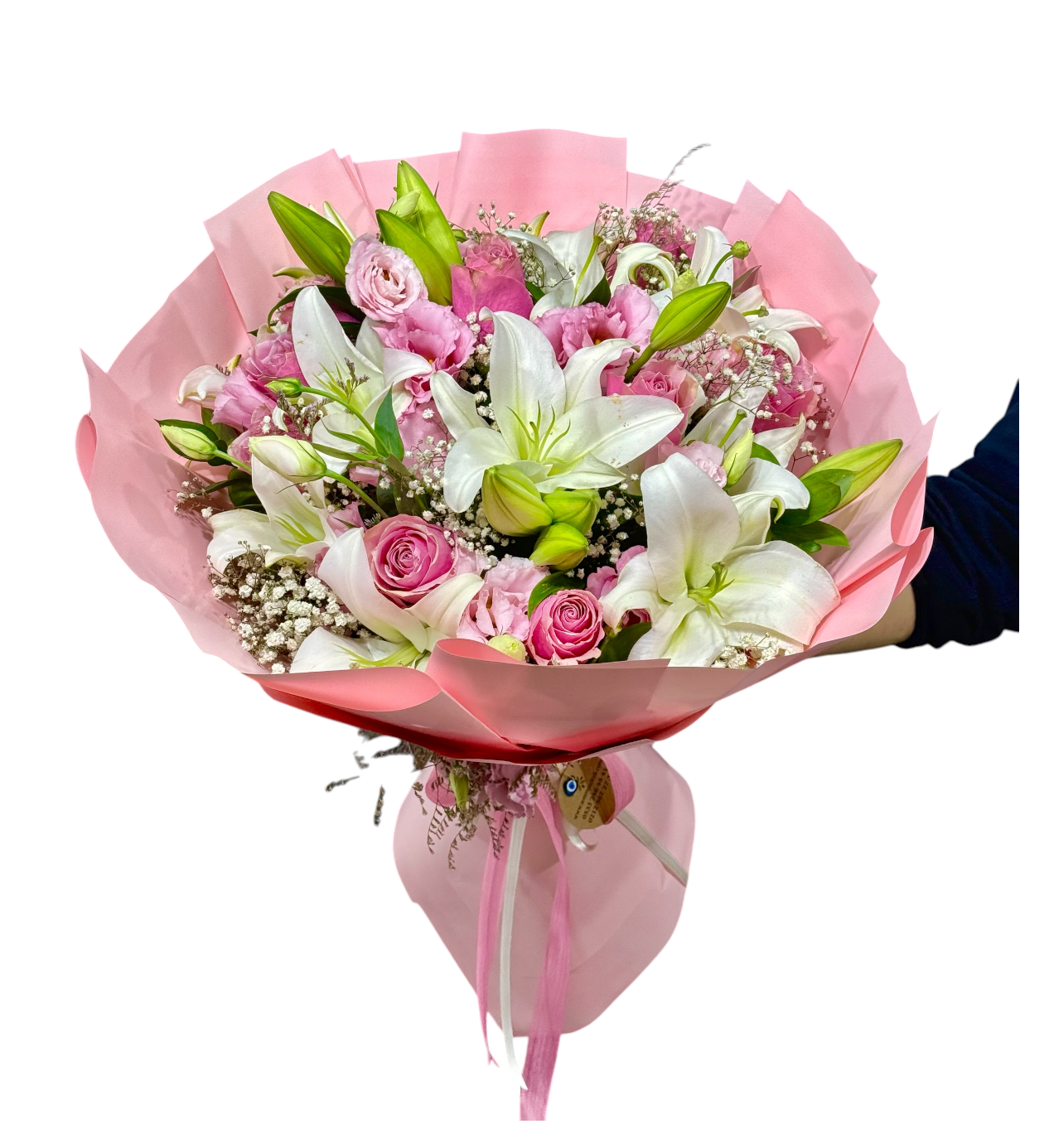 Yaklaşık 50 cm genişliğinde ve 70 cm yüksekliğindedir. İçeriğinde 20 adet taze ekvator pembe gül, 5 adet beyaz lilyum, lisyantus, cipsofya ve doğal yeşillikler bulunmaktadır. Her çiçek, tazeliğini koruyacak şekilde hazırlanır ve görseldeki kalite standardında teslim edilir.