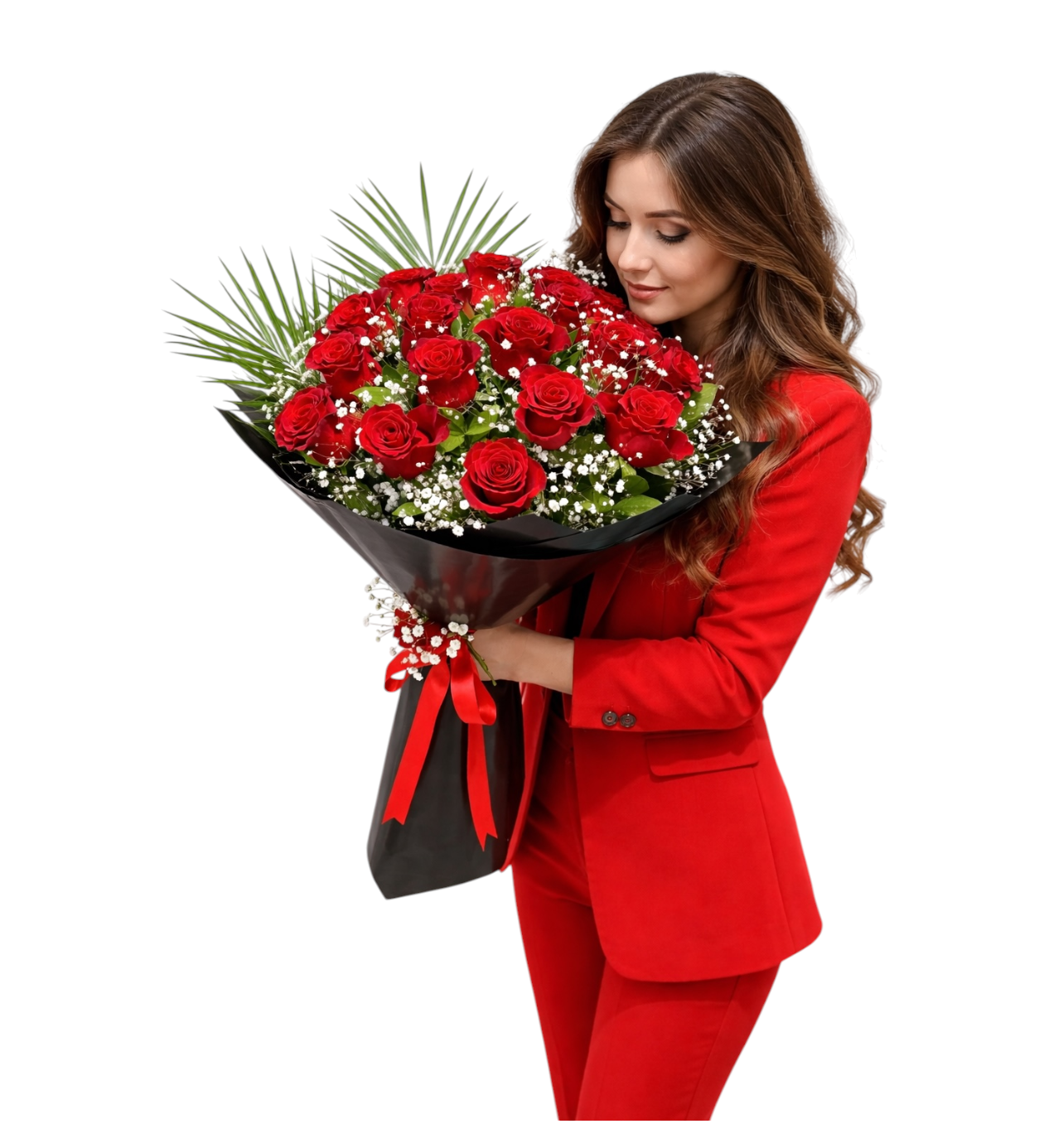 Siyah ambalaj ve kırmızı kurdele ile hazırlanan buket hem klasik hem modern bir görünüm sunar