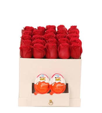 Şık ve zarif bir kutu içerisinde düzenlenmiş 25 kırmızı güller ve çekmeceli bölümde yer alan 2 adet Kinder Joy sürpriz çikolataları bulunmaktadır. Beyaz kutu tasarımı, güllerin canlı kırmızı rengiyle uyum içinde olup romantik ve tatlı bir hediye konsepti oluşturulmuştur.