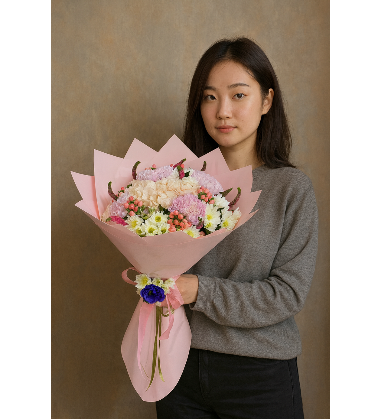 Yaklaşık 60 cm boyundaki bu zarif buket pastel tonlarda hazırlanmış olup beyaz krizantemler pembe ortancalar ve lila tonlu çiçeklerle harmanlanmıştır modern pembe ambalajı ve zarif kurdelesiyle romantik bir görünüm sunar özel günlerde sevginizi sade ve şık bir şekilde ifade etmeniz için idealdir