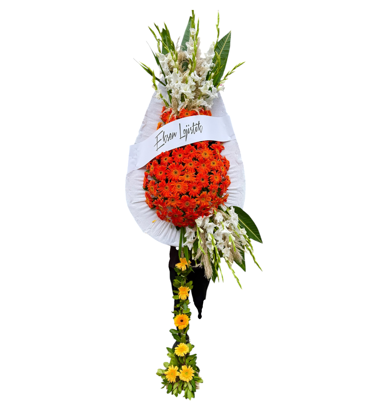 2 metre boyundaki bu görkemli çelenk turuncu gerbera ve beyaz glayör çiçeklerinin zarif uyumuyla hazırlanmıştır canlı renkleriyle dikkat çeken bu çelenk düğün açılış ve nikah törenlerine şıklık ve prestij katar dayanıklı taze çiçeklerle özenle tasarlanmış olup profesyonel montajı sayesinde uzun süre formunu korur