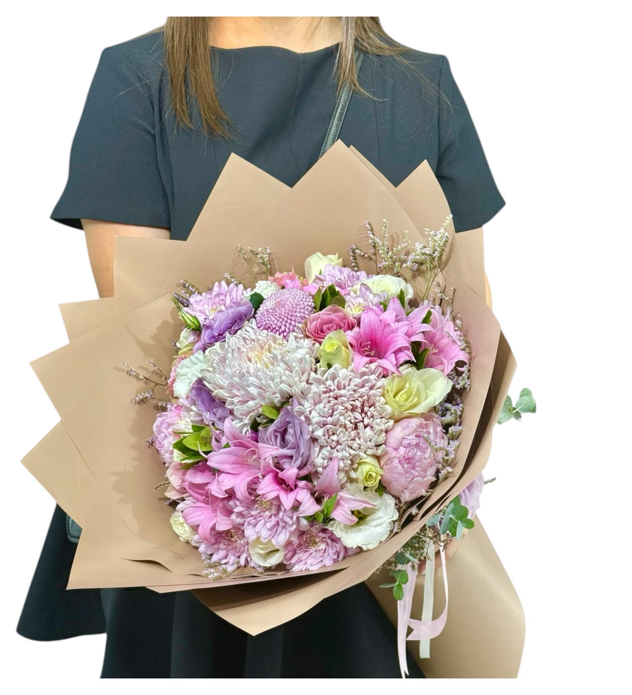 Pastel tonların zarafetini bir araya getiren Blush Harmony, pembe, mor ve beyaz tonlarında hazırlanmış özel bir çiçek buketidir. Lilyum, krizantem, lisyantus, gül ve şakayık çiçeklerinin romantik uyumu sayesinde hem yumuşak hem de göz alıcı bir duruşa sahiptir. Özel kraft kâğıdıyla sarılmış şık tasarımı, zarif kurdele detayıyla tamamlanmıştır.
