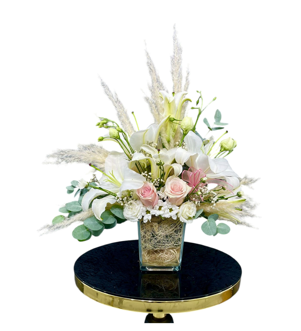 Beyaz lilyumlar, pastel pembe güller, lisyantuslar, pampas otları ve okaliptus yapraklarıyla zarif bir uyum oluşturur.